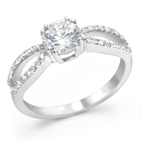 Product Details: The exquisite look of pave czs accents the sparkling .65 carat focal stone in this very classy .925 sterling silver engagement ring. The details are what make a stunning engagement ring the one that has it all. One shimmering round central diamond is held securely with 8 prongs. Radiating from this center point are 32 radiant pave czs in an infinity pattern. The rest of the band is high polished sterling silver that will give her infinite comfort and shine with rhodium plating. Let her know your love will last a lifetime and more with this classic cz engagement ring.