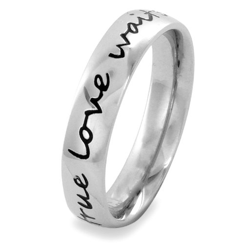 Product Details: Make a timeless statement with this polished stainless steel ring from Elya Designs. Features the "true love waits" message twice around in a contemporary script font.