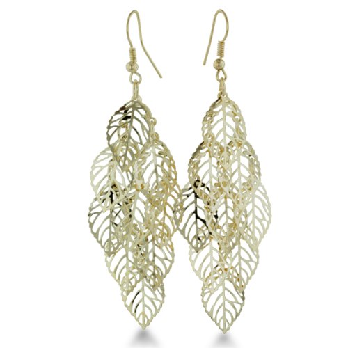 Product Details: For a fresh look, try these dangling gold tone leaf earrings. These lightweight earrings feature 9 dangling leaves each and are 3 inches long.