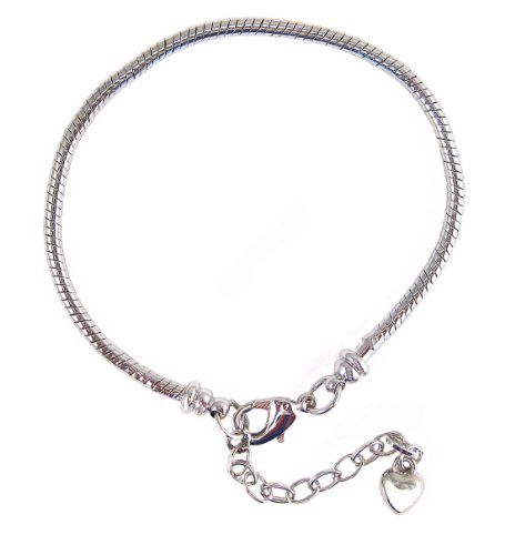 Product Details: Beautiful snake chain bracelet has a "twist off" lobster claw end to easily load Pandora, Biagi, Chamilia, Troll style core beads. Once assembled back, beads WILL NOT slide off the bracelet which makes putting the bracelet on much simpler. Made of bright silver-tone plated metal, bracelet measures 8-1/2" and also has a 1-1/2" extension chain with adorable heart drop to accommodate more wrist sizes. Will fit ALL styles of beads with 3mm cores or larger.
