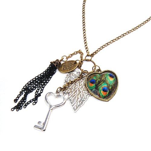 Buy World Pride Retro Tassel Peacock Feather Pattern Heart Key Leaf Multi Pendant Necklace with the cheapest price ever to save money.